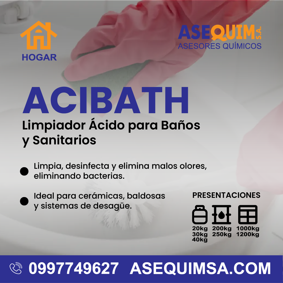 El ACIBATH es un limpiador ácido concentrado y biodegradable, diseñado para eliminar sarro, desinfectar y desodorizar superficies en baños y áreas sanitarias. Su fórmula potente combina ácidos inorgánicos con acción germicida, garantizando resultados óptimos en inodoros, urinarios, pisos y cerámicas sin dañar los materiales.