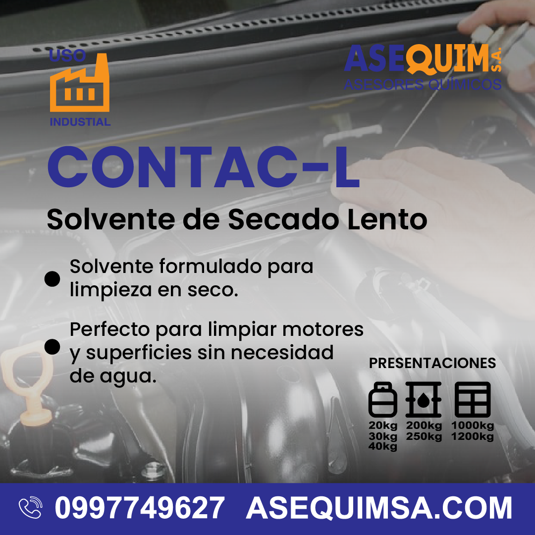 CONTAC-L es un solvente de secado lento formulado para la limpieza en seco de superficies, especialmente diseñado para aplicaciones en mantenimiento de motores. Su composición equilibrada asegura una evaporación controlada, facilitando la eliminación eficaz de residuos sin dañar los materiales.