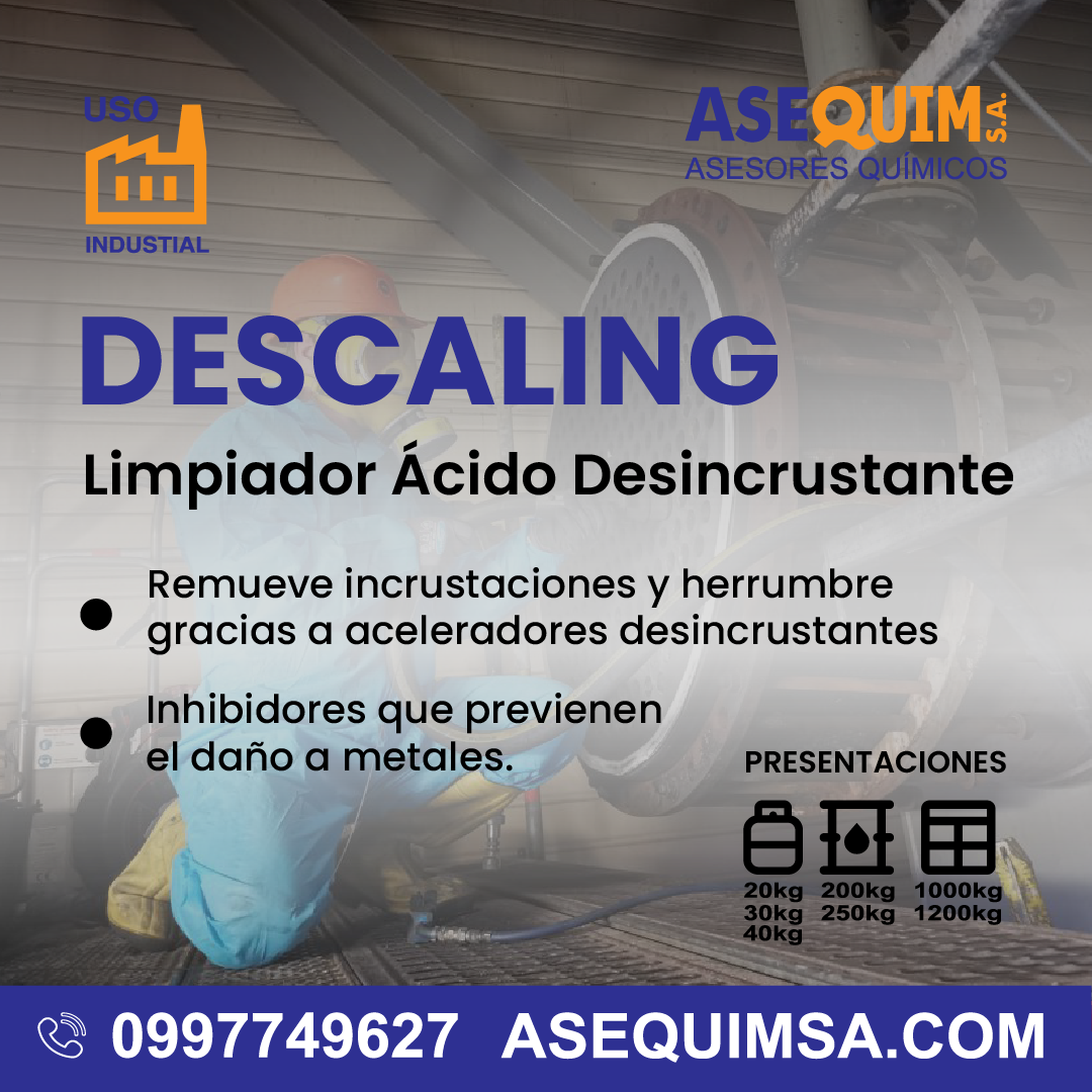 El DESCALING es un líquido ácido concentrado formulado para eliminar incrustaciones, óxido y depósitos minerales en sistemas industriales. Su combinación de agentes desincrustantes e inhibidores de corrosión garantiza una limpieza eficaz sin dañar metales, ideal para equipos críticos como intercambiadores de calor y calderas.