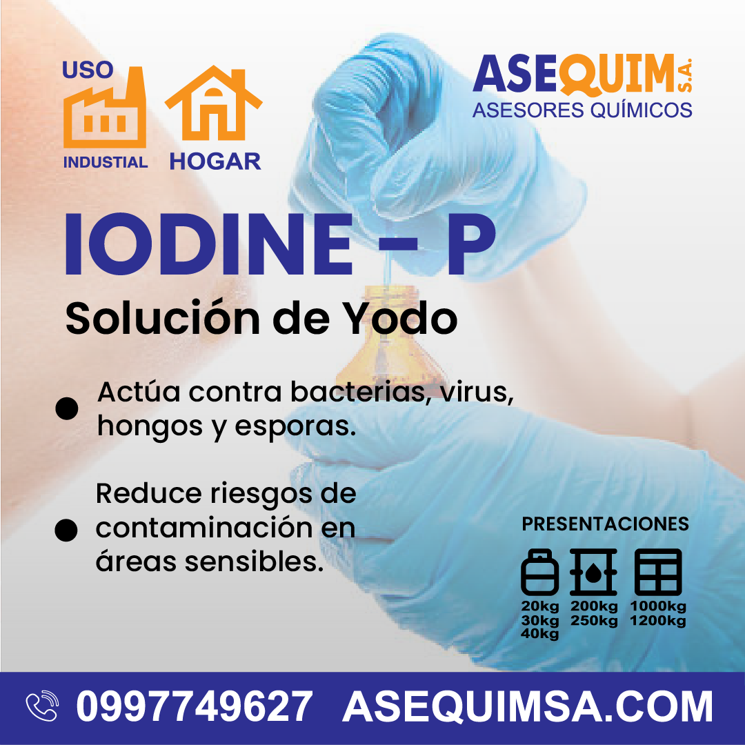 El IODINE-P es una solución antiséptica de amplio espectro formulada a base de yodo metálico, diseñada para eliminar bacterias, hongos, esporas y virus en entornos de alto riesgo sanitario e industrial. Su acción rápida y eficaz lo hace indispensable en la desinfección de superficies, equipos y áreas críticas.
