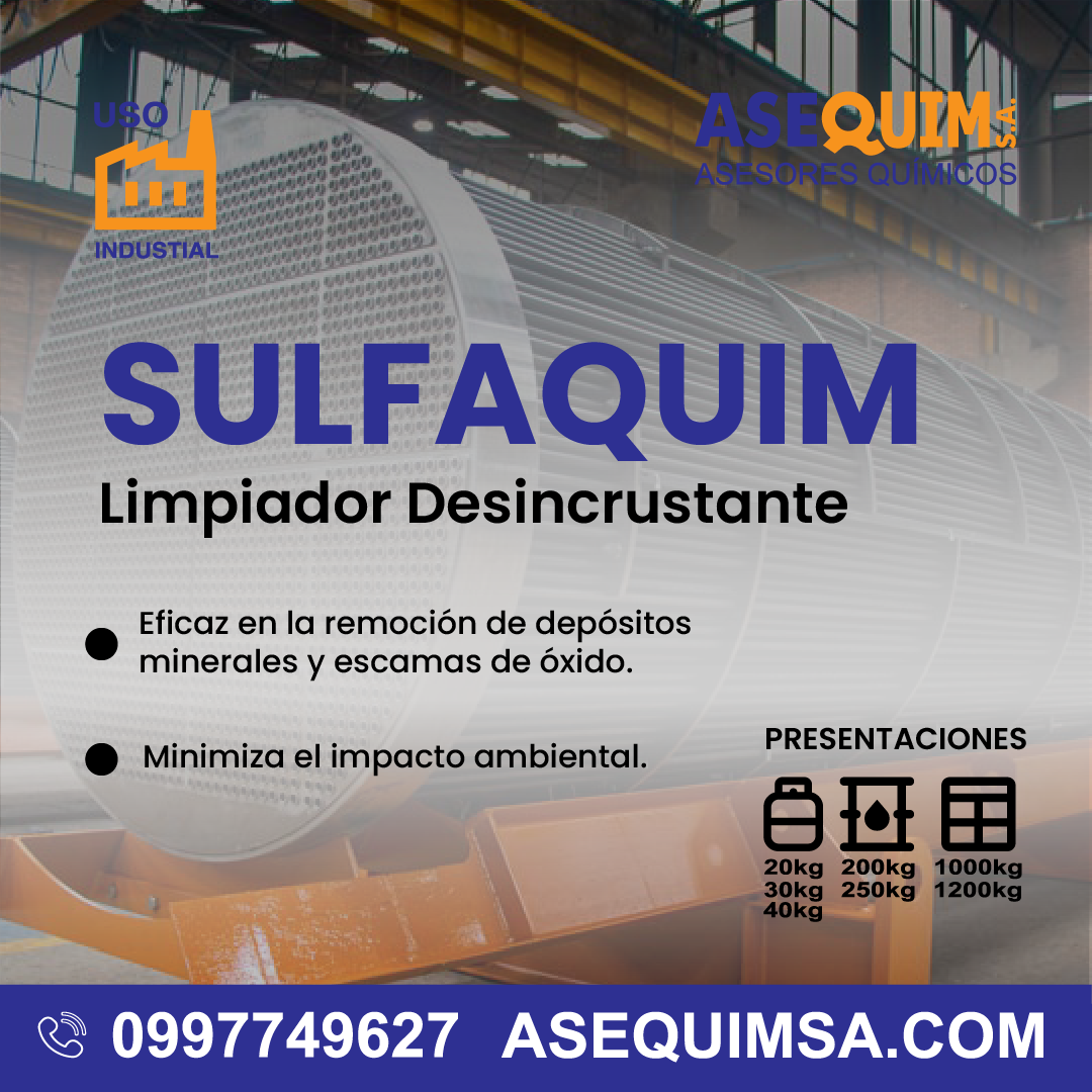 El SULFAQUIM es un limpiador ácido concentrado diseñado para eliminar incrustaciones y óxido en sistemas industriales críticos como intercambiadores de calor y torres de enfriamiento. Su fórmula combina ácido amidosulfúrico con inhibidores de corrosión, asegurando una limpieza eficaz sin dañar los materiales metálicos.